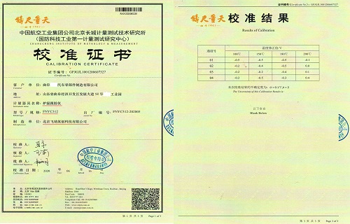 公司為山東曲阜某汽車零部件制造商定制生產(chǎn)的FNYC312型爐溫跟蹤儀日前通過了檢定校準測試。該測試是在中國航空工業(yè)集團公司北京長城計量測試技術(shù)研究所(國防科技工業(yè)第一計量測試研究中心,簡稱304所)的溫度檢測室進行的。校準測試結(jié)果為:分辨率0.1°C,精度為0.5°C。性能指標完全滿足用戶使用要求。